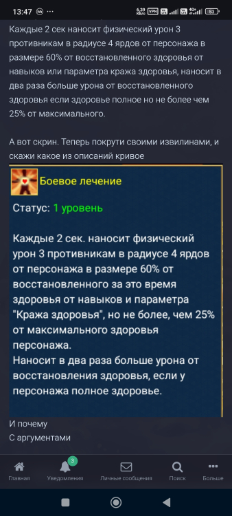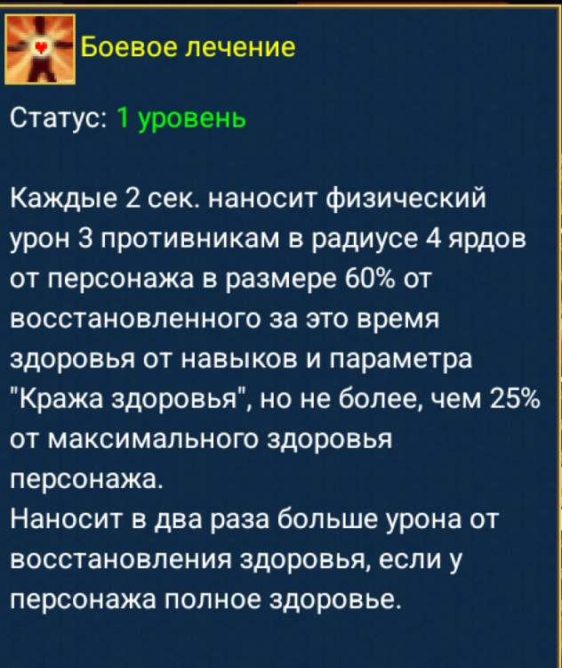 А теперь, для твоей коробочки: Каждые 2 сек наносит физический урон 3 противникам в радиусе 4 ярдов от персонажа в размере 60% от восстановленного здоровья от навыков или параметра кража здоровья, наносит в два раза больше урона от восстановленного здоровья если здоровье полное но не более чем 25% от максимального. А вот скрин. Теперь покрути своими извилинами, и скажи какое из описаний кривое И почему С аргументами -