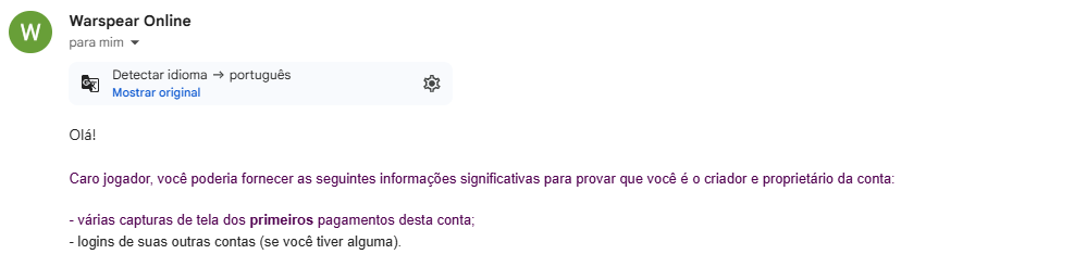 Tive minha conta roubada em 2022 e estou tentando com o suporte do wasrpear pelo email support@warspear.freshdesk.com a recuperação de minha conta, o processo está tão difícil porque além de ter perdido meu acesso ao jogo poucos dias depois de ter tido minhas informações roubadas, percebi que muitos emails que eu tinha também foram excluídos, um destes era o email de acesso a minha conta, estou a mais de 1 mês falando com o suporte e ainda não conseguiram fazer nada mesmo eu tendo passado informações que somente o dono possui, e informações minhas, como dispositivos que usei, locais onde usei a conta, endereços, emails de logins, várias cpturas de tela de pagamentos que fiz na minha conta antes de perder o acesso. Mesmo após tudo isso e mais de 30 dias em contato com o suporte, ainda não puderam recuperar mihas credenciais, isso é muito frustrante. Essa conta minha no fórum é minha ultima conta vinculada ao endereço de email qeu eu fazia login no jogo, se fosse possível de alguma forma que eles verificassem minhas credenciais aqui veriam que o acesso a conta antiga ainda está vincudo aqui e que sou o verdadeiro dono da minha conta. Muito frustrante não conseguir ter devolta algo que foi tirado de mim.